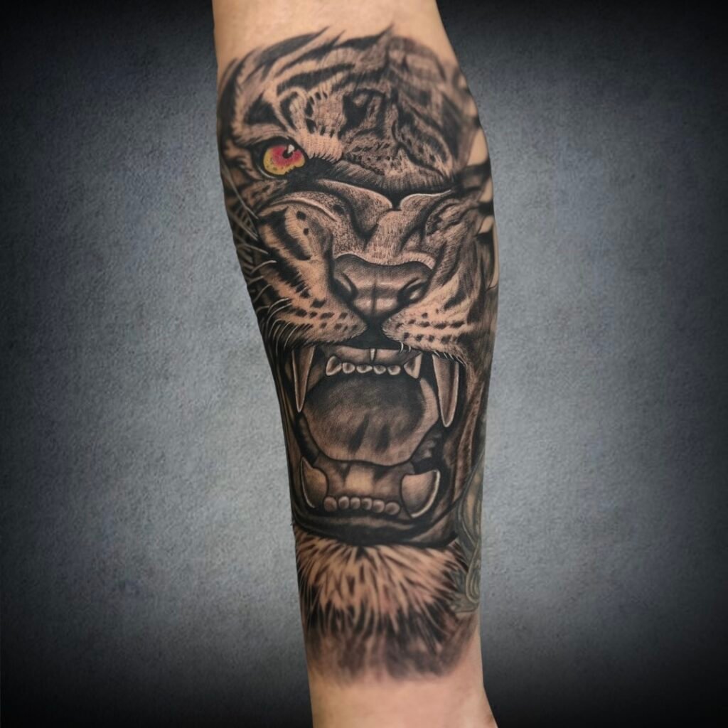 A tiger tattoo symbolizes power, courage, and dominance. The roaring tiger design represents the warrior within — fierce, alert, and unshakable.
