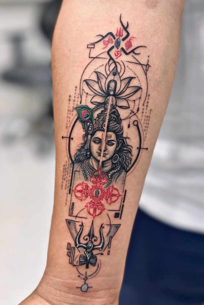 The first tattoo reflects Lord Shiva, the god of transformation, creation, and destruction, often depicted with his trident, his serene expression, and the sacred Ganga flowing from his hair. This tattoo combines elements of modern geometric design with traditional mythological art. The clean lines and vivid colorwork, like the peacock feather and red accents, elevate the spiritual presence of Shiva, creating a perfect balance of chaos and peace, destruction and creation. The symbols surrounding him reinforce the dynamic energy of this tattoo, representing cosmic harmony.