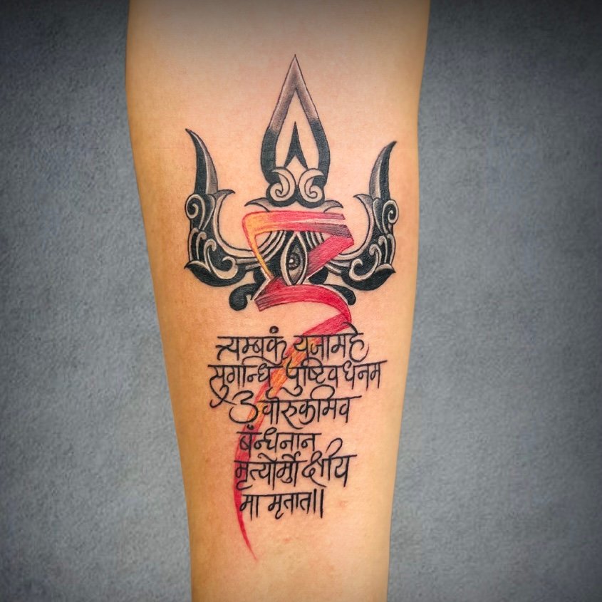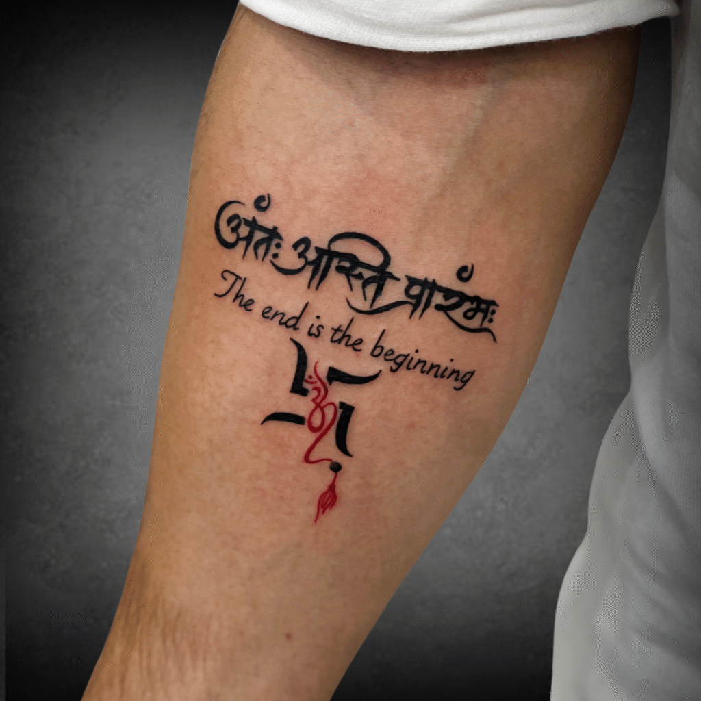 “अन्त: अस्ति ब्रह्म” (The end is the beginning): This phrase echoes the cyclical nature of life, death, and rebirth that Shiva governs. The tattoo acts as a spiritual reminder that with every ending, a new journey begins.